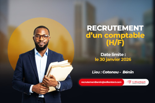 Merci de bien vouloir nous faire parvenir votre candidature (CV et lettre de motivation) par Email à l’adresse : recrutementbenin@adkontact.com au plus tard le 30 janvier 2026 avec pour objet : Candidature au poste de Comptable.