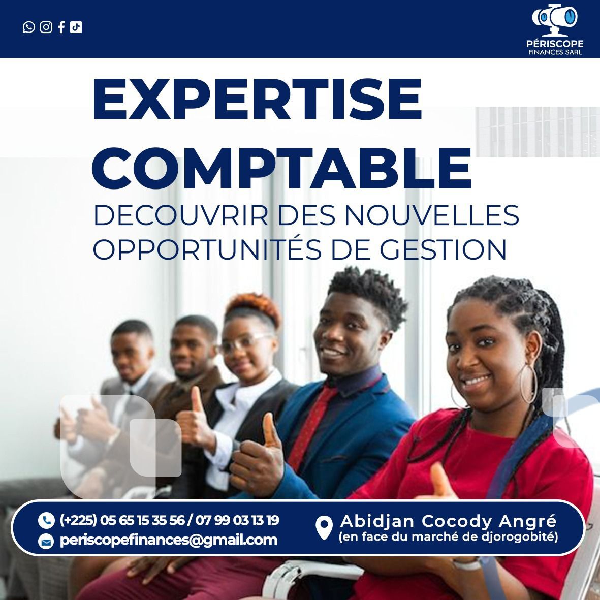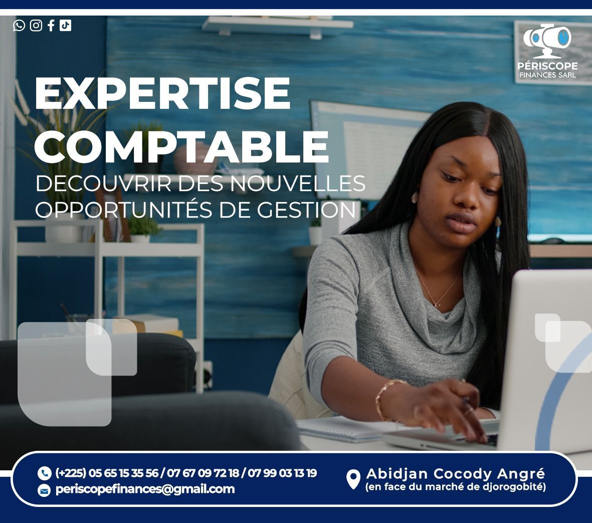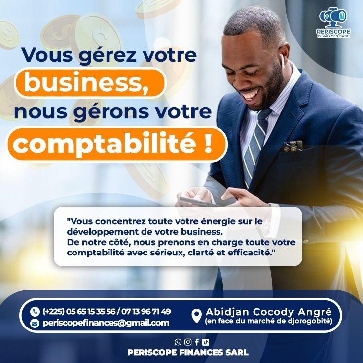 PERISCOPE FINANCES SARL, est un cabinet d’Assistance Comptable et de Conseils en Gestion d’entreprise. Notre principale mission est d’accompagner les entrepreneurs, start-up, PME et grandes Entreprises à chaque étape de leur développement grâce à la mise à disposition de compétences pointues dans les domaines de la comptabilité, de la fiscalité, de la création d’entreprise, de l’étude de projet et du conseil.