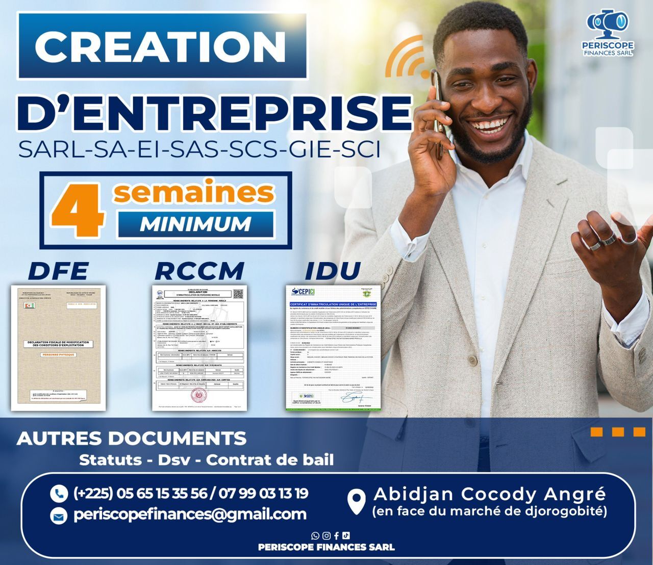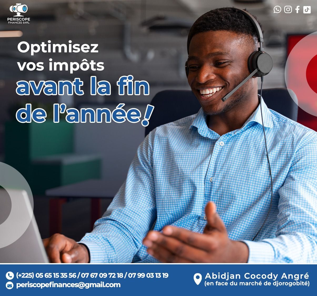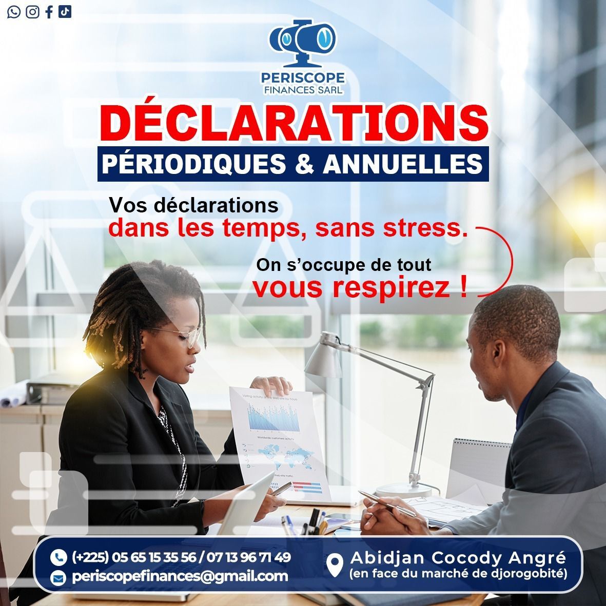 PERISCOPE FINANCES SARL, est un cabinet d’Assistance Comptable et de Conseils en Gestion d’entreprise. Notre principale mission est d’accompagner les entrepreneurs, start-up, PME et grandes Entreprises à chaque étape de leur développement grâce à la mise à disposition de compétences pointues dans les domaines de la comptabilité, de la fiscalité, de la création d’entreprise, de l’étude de projet et du conseil.