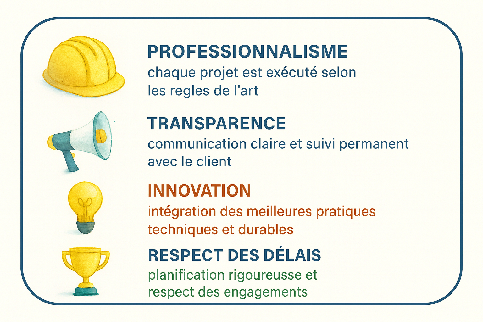Forte d’une expertise complète, elle accompagne ses clients : Particuliers, Entreprises et Institutions, de la fondation à la finition, avec un engagement constant : qualité, durabilité et respect des délais.