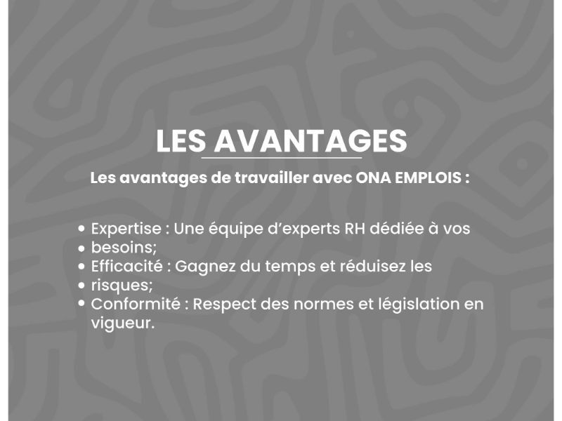 Grâce à cette approche globale, ONA Emplois & Consulting se positionne comme un partenaire stratégique pour les entreprises souhaitant recruter efficacement, structurer leurs ressources humaines et sécuriser leur développement.