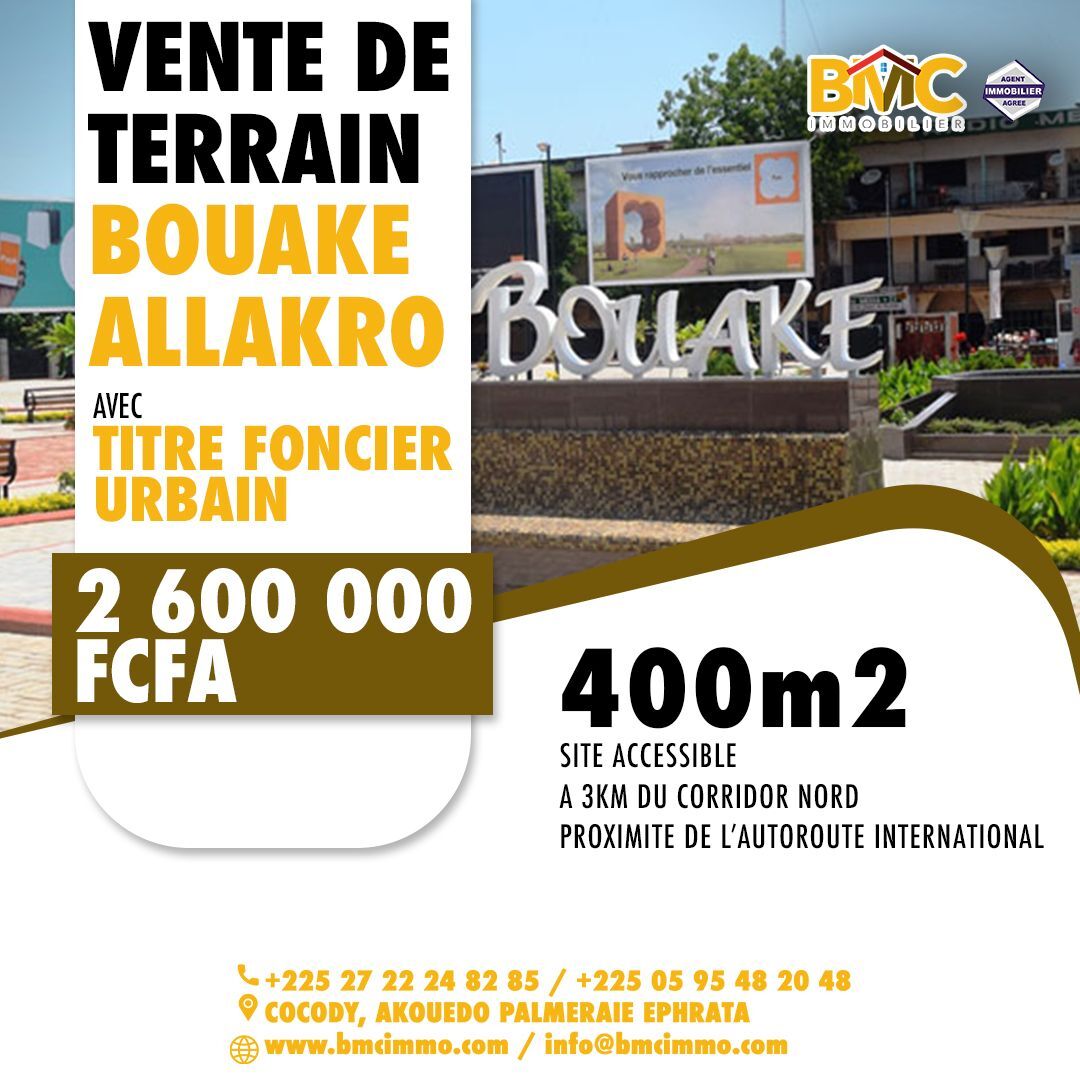 Dans la ville dynamique de Bouaké, BMC Immobilier vous propose des terrains de 400 à Allakro avec Titre Foncier Urbain.