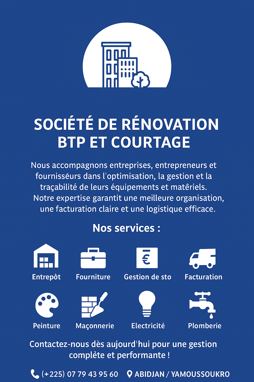 Bonjour Mlle, Mme et Mr. Nous sommes une entreprise Individuel spécialisé dans la peinture intérieur et extérieur, carrelage, plomberie, menuiserie, électricité cadre fenêtre, porte blinder , location de matériel BTP et vente immobilière depuis 1976, vous avez des soucis pour faire des rénovations dans votre Maison, Bureau ou Hôtel? Ou vous êtes dans le besoin d’innover, rénover, adapter, ou trouver des marchés occidentaux, conditions favorables.