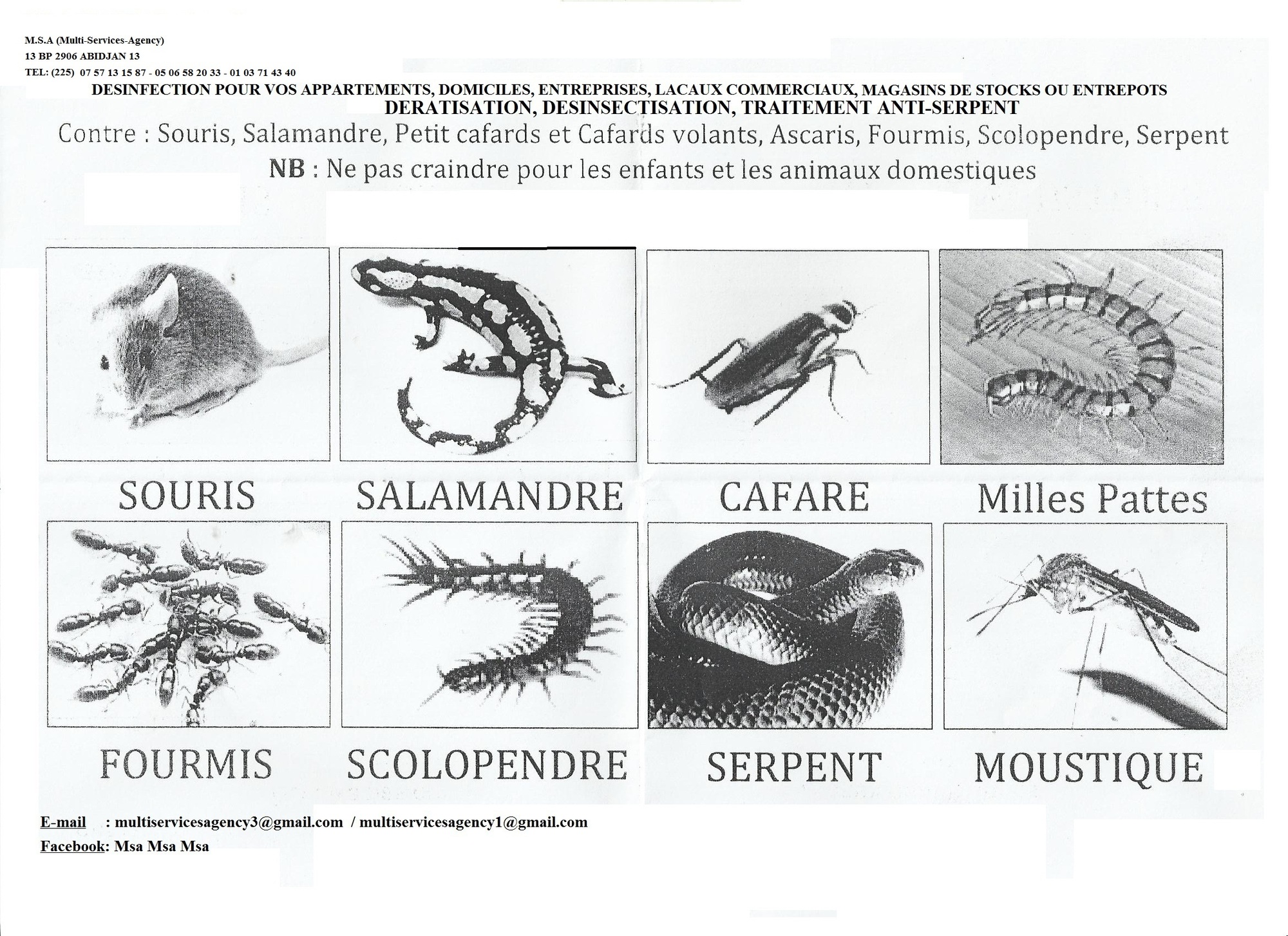 Lavage des sols bétonnés, gravillonnés et bitumés ; Dégraissage et lavage des sols d’atelier ; Aspiration et shampoing des moquettes et tapis ; curage des caniveaux ; Décapage et nettoyage des faïences ; Ponçage, décapage et vitrification du marbre et du granito ; Plantation de gazon, fleures et arbustes ; Tonte et arrosage du gazon et des plantes ; Dératisation, désinsectisation, Traitement anti- serpent.