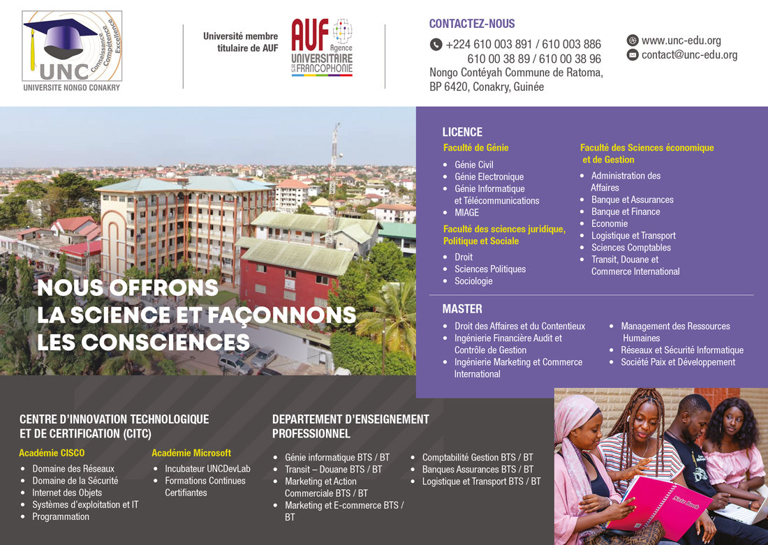 UNC est Située en plein coeur de Nongo-Conteyah dans un quartier résidentiel, paisible et sécuritaire, avec un accès facile, elle a été créée à l’initiative de cadres Guinéens diplômés d’universités américaines, françaises, canadiennes et marocaines, afin de donner la chance aux jeunes étudiants Africains de s’épanouir à l’instar de leurs confrères Occidentaux et Asiatiques.