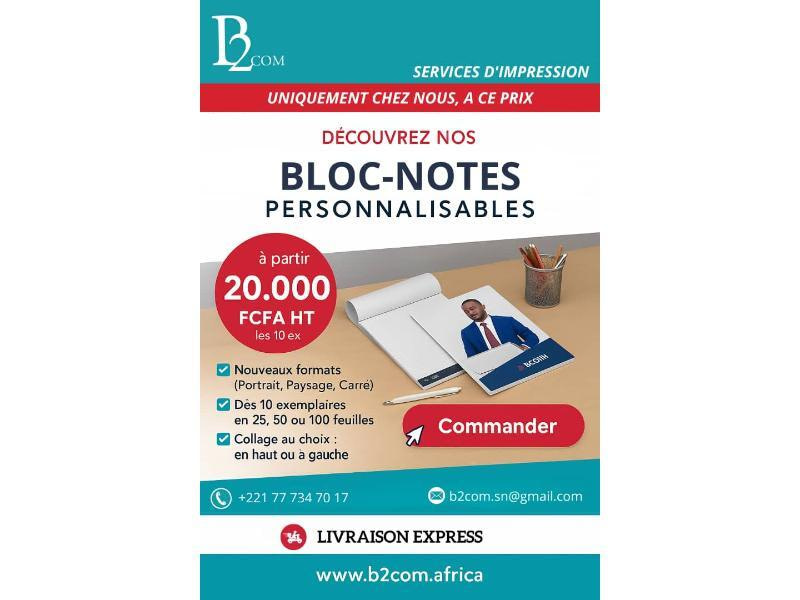 B2 COM est une imprimerie moderne et dynamique basée au Sénégal, spécialisée dans la création et l’impression de supports de communication pour entreprises, institutions et particuliers. Notre mission : offrir des produits imprimés de qualité, à prix justes et accessibles à tous, pour renforcer l’impact visuel de vos projets et événements.