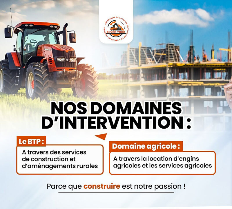 agricole, ELVEC TOGO accompagne les exploitants avec des solutions adaptées, comme la location de tracteurs et bulldozers. L’entreprise intervient également dans le dessouchage, le labour, la construction de bassins de rétention d’eau et l’aménagement rural, contribuant ainsi à la modernisation des pratiques agricoles et à l’amélioration des rendements.