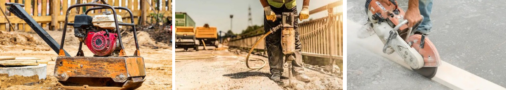 outils de construction, notamment des plaques vibrantes, scies à béton, dameuses et marteaux-piqueurs. Ces équipements fiables et régulièrement entretenus garantissent une exécution optimale des travaux.
