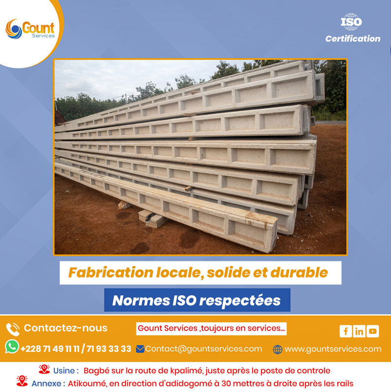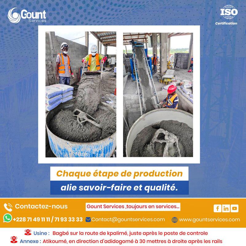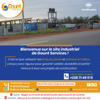 Située à Bagbé sur la route de kpalimé après le poste de contrôle, Gount Services, est une filiale de Global InnovaPower International LLC. Une entreprise innovante et visionnaire, crée le 19 août 2019 sous la direction éclairée du Dr GOUTENI Kalimou. Spécialisée dans la fabrication de poteaux en béton, de pavés, de caniveaux et de briques préfabriquées, notre entreprise manufacturière aspire à devenir un acteur majeur, tant sur le plan national qu'international.