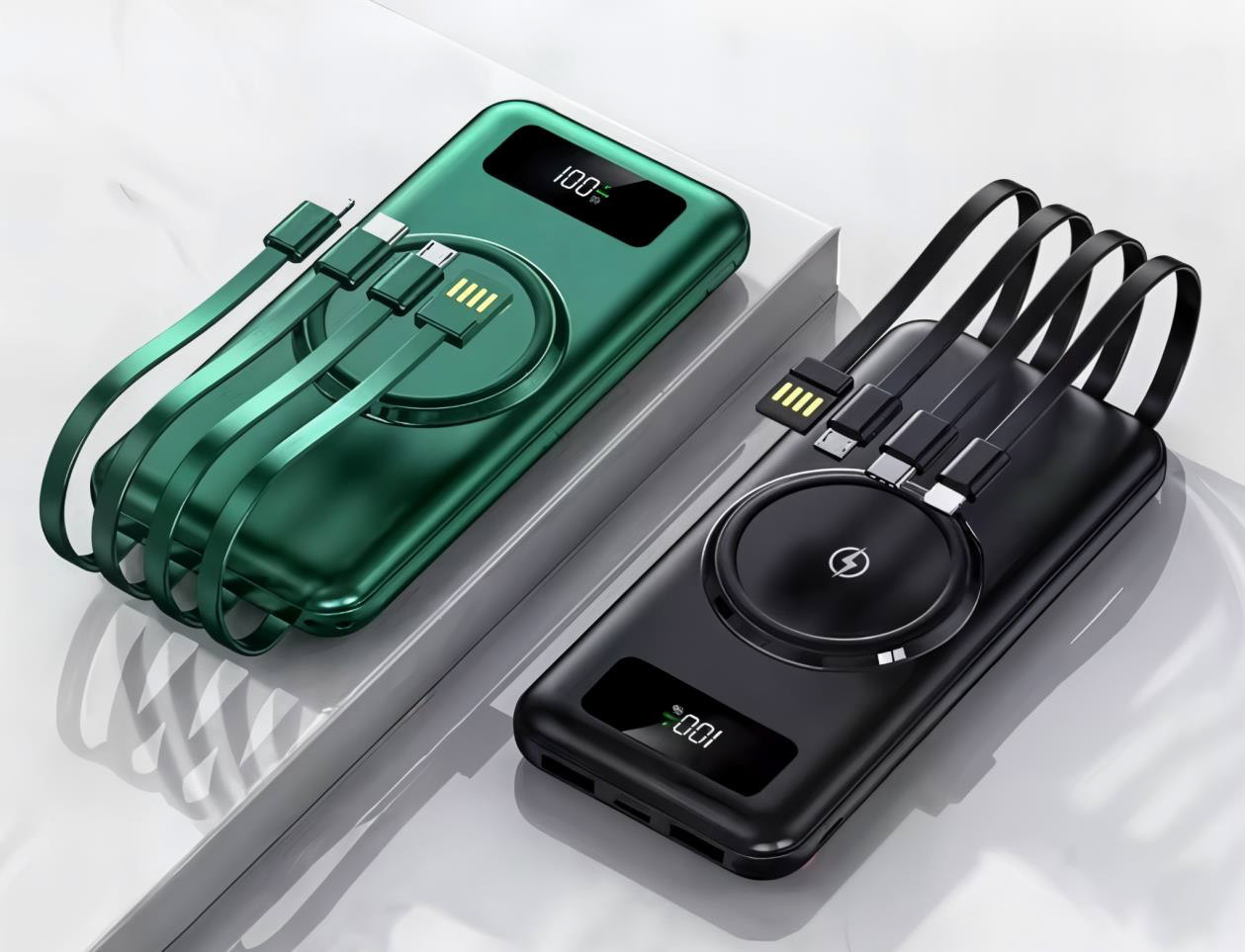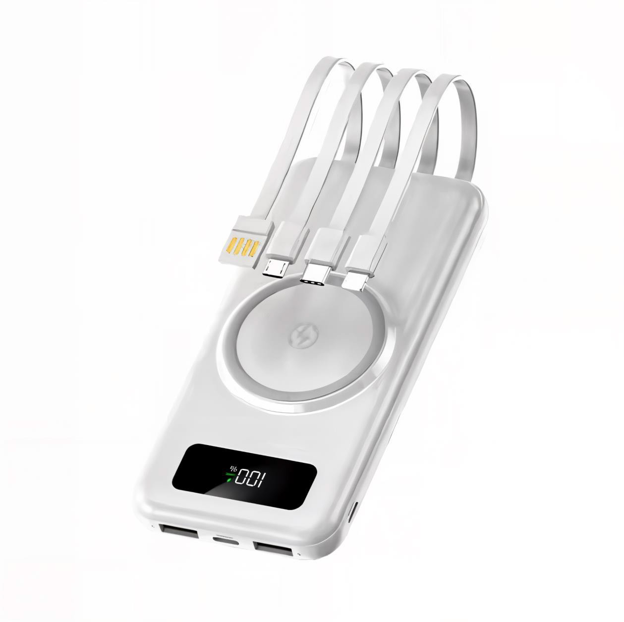 🔄 Banque d'alimentation 20000 mAh ou 30000 mAh pour recharger vos téléphones par Induction et câbles (4 lignes) avec affichage numérique. Couleurs disponibles: Noir, Vert, Blanc.