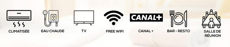 Notre complexe hôtelier met à votre disposition des chambres entièrement climatisées, garantissant un confort optimal en toute saison. Profitez d’équipements modernes pensés pour répondre à toutes vos attentes : climatisation performante, eau chaude permanente, télévision avec chaînes câblées pour vos moments de divertissement, ainsi qu’un accès Wi-Fi haut débit pour rester connecté en toute simplicité.
