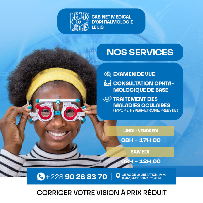 Situé sur l’Avenue de la Libération, dans l’immeuble INAM, face à la BOAD, le Cabinet Médical d’Ophtalmologie Le Lis est un centre de référence à Lomé pour les