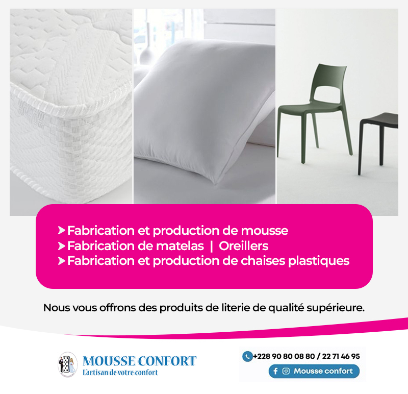 MOUSSE CONFORT est une usine spécialisée dans la fabrication de mousses, matelas et oreillers, implantée sur le territoire togolais, derrière le Grand Moulin. Depuis sa création, l’entreprise s’est progressivement imposée comme un acteur majeur de l’industrie de la literie, non seulement au Togo mais également dans plusieurs pays de la sous-région ouest-africaine.